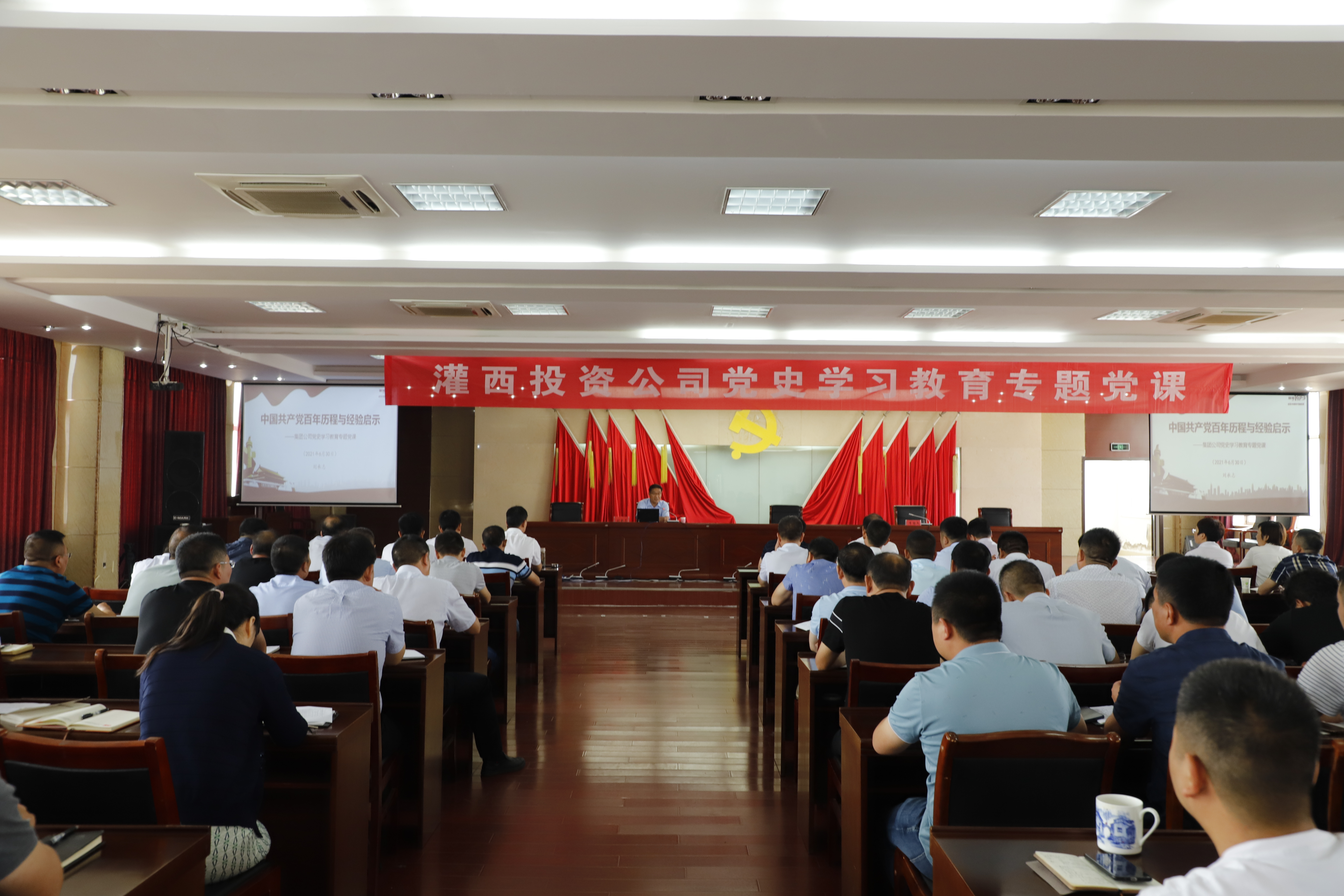 按照集團(tuán)公司統(tǒng)一安排部署,推進(jìn)黨史學(xué)習(xí)教育走深走實(shí),6月30日上午,灌西投資公司舉辦黨史學(xué)習(xí)教育專題黨課學(xué)習(xí)會(huì)。集團(tuán)工會(huì)主席劉承志以“中國(guó)共產(chǎn)黨百年歷程與經(jīng)驗(yàn)啟示”為題專題授課。投資公司領(lǐng)導(dǎo)班子成員、各單位黨政負(fù)責(zé)人、機(jī)關(guān)全體黨員參加學(xué)習(xí)。灌西投資公司黨委書(shū)記、董事長(zhǎng)、總經(jīng)理李國(guó)文主持會(huì)議。