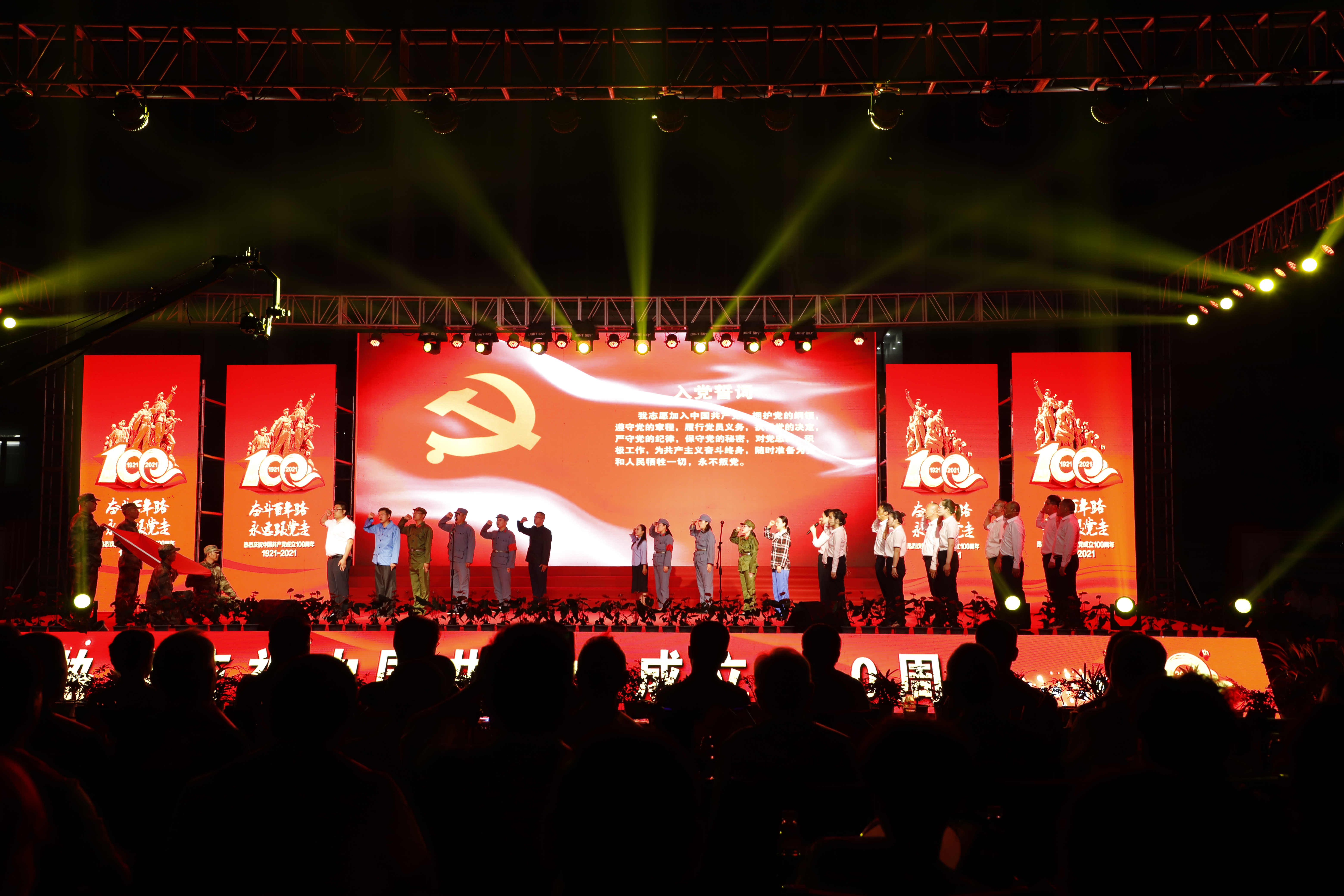 百年征程路漫漫,燦爛輝煌激人心,是中國共產(chǎn)黨指給了人民解放的道路,領(lǐng)導(dǎo)中國走向光明,是中國共產(chǎn)黨引領(lǐng)中華民族走向復(fù)興之路,奮進(jìn)新時代、開啟新征程,最后,全場人員同唱《沒有共產(chǎn)黨就沒有新中國》,10面國旗、10面黨旗在揮舞,整個舞臺成為一片紅的海洋,整場晚會圓滿落下帷幕。