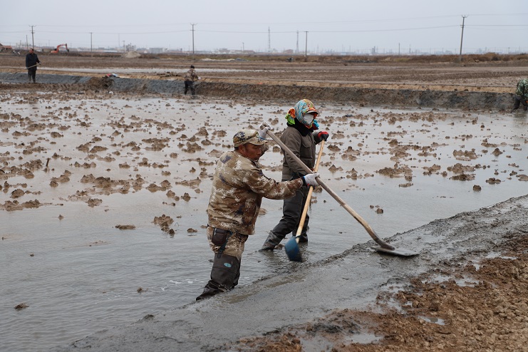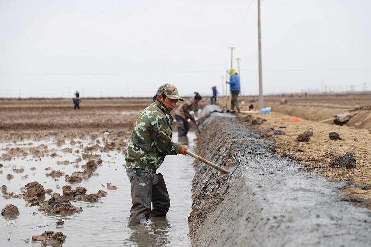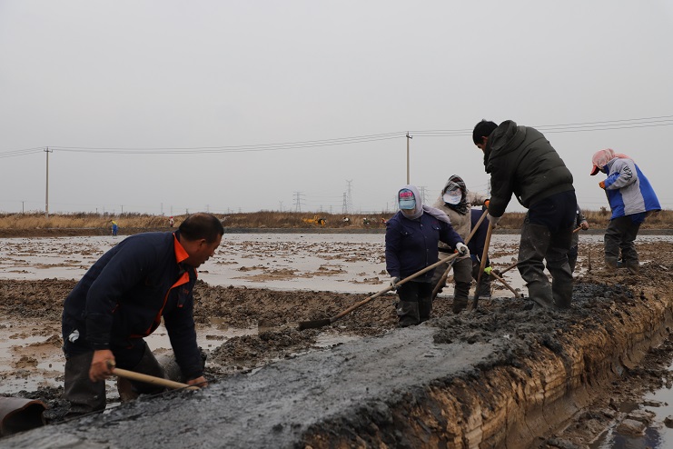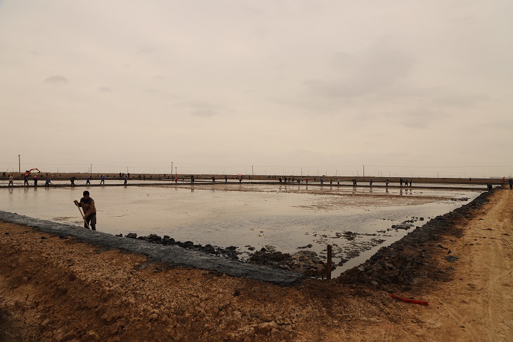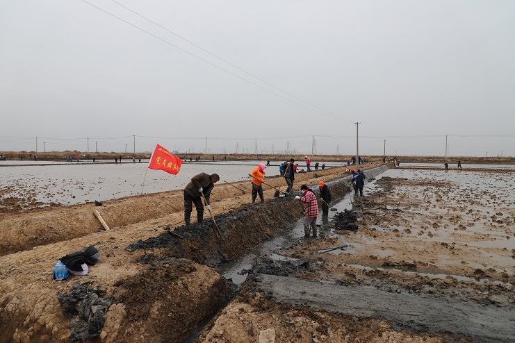 11月29日上午,雖然天氣寒冷,但是在海鹽基地新改造的制鹵灘上,卻到處是一派火熱的勞動(dòng)景象,參加“大會(huì)戰(zhàn)”的工人多達(dá)100余人,只見他們有的潑水,有的鏟泥,有的撈溝,有的做埝,大家分工協(xié)作。據(jù)了解,為了提高海水制鹵能力,確保海鹽產(chǎn)量,今年公司專門對(duì)海鹽基地部分廢棄灘地進(jìn)行了改造,以進(jìn)一步增加制鹵面積。近期,隨著改造工程接近尾聲,公司又組織精干力量對(duì)新改造灘地繼續(xù)進(jìn)行修整,以確保新建的制鹵灘地能夠盡快投入使用,為明年海鹽生產(chǎn)工作的正常有序開展奠定扎實(shí)的基礎(chǔ)。