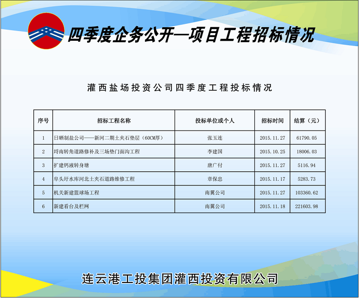 四季度灌西共開工建設6個工程項目,分4次由投資公司招標領(lǐng)導小組采用公開邀標形式進行了招標。