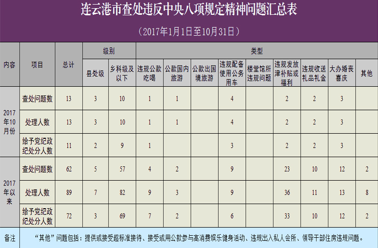 為進(jìn)一步貫徹落實(shí)中央八項(xiàng)規(guī)定精神,連云港市紀(jì)委建立了落實(shí)中央八項(xiàng)規(guī)定精神情況月報(bào)制度。2017年1月1日至10月31日,全市查處違反中央八項(xiàng)規(guī)定精神問題情況如下: