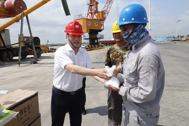 7月28日,投資公司黨委書記、董事長李國文,黨委副書記王宏一行深入宵洋物流公司碼頭生產(chǎn)作業(yè)現(xiàn)場,走訪慰問奮戰(zhàn)在一線的員工,為一線員工送上牛奶、綠豆等防暑降溫物品,在酷熱的夏日帶來絲絲清涼。