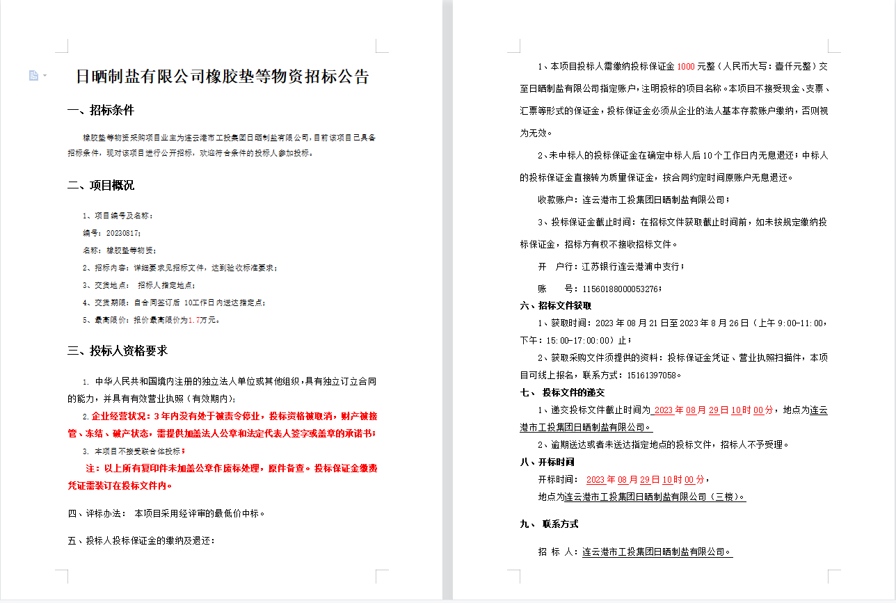 日曬制鹽有限公司橡膠墊等物資招標(biāo)公告
