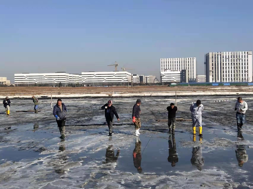 礦鹽復(fù)產(chǎn)項(xiàng)目部,聘請(qǐng)日曬制鹽專家王緒前進(jìn)行工藝指導(dǎo),聘請(qǐng)勞模朱春年帶領(lǐng)團(tuán)隊(duì)攻堅(jiān)。復(fù)產(chǎn)戰(zhàn)役從2021年12月就打響了,春節(jié)的時(shí)候,他們僅休了三天假,大年初三全部到崗,一鍬一鍬挖泥通溝,一條一條池堰加高整平,一塊一塊鹽田清理壓實(shí)......到2月,他們硬是把征地后廢棄許久的鹽田和邊角地整理成礦鹽基地,結(jié)晶池面積達(dá)1950公畝,達(dá)產(chǎn)可產(chǎn)原鹽20000噸。