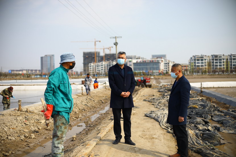 第一站來到海州灣公司昌圩班組。該班組4月1日礦鹵灌池,目前第四塊結(jié)晶池正在進鹵,該公司三大組長帶著各自隊伍都來支援,一起給新灌結(jié)晶池更換新塑苫布,大家忙的不亦樂乎。王董事長首先慰問大家,新冠疫情暴發(fā)以來,海州灣公司廣大員工克服困難,一邊強化疫情防控,一邊加班加點抓生產(chǎn),雖然有的工作耽誤了,但是礦鹵灌池工作仍然趕在天時轉(zhuǎn)好之前進行了。昨天進鹵的結(jié)晶池底已經(jīng)鋪上了一層鹽,看起來甚是喜人。昌圩班組負責人,老先進老黨員朱春年同志看到王董事長來檢查工作,他也非常高興,和海州灣公司負責人劉天義一同聚攏過來,與董事長攀談,匯報工作。最后王董事長強調(diào),一定要抓緊灌池,抓緊更換新塑苫布,打好“礦鹵復產(chǎn)”戰(zhàn),我們基礎(chǔ)產(chǎn)業(yè)牢固了,臺北的發(fā)展也就穩(wěn)固了。同時,也不要忘記抓好疫情防控工作,職工集體工作時要保持一米線距離,保證不扎堆。劉天義、朱春年代表職工表態(tài),一定按照投資公司有關(guān)布置抓好各方面工作,一定拼命干,加油干,爭當虎將打頭陣,當好“臺北保衛(wèi)戰(zhàn)”主攻隊。