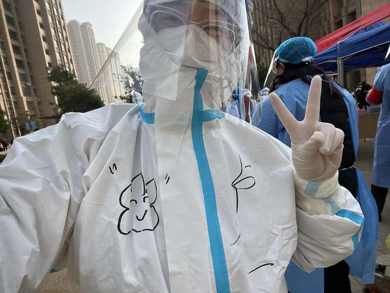 ? 3月12日,晴,8:00到達(dá)社區(qū)核酸采樣點,準(zhǔn)備上崗,社區(qū)負(fù)責(zé)人給我們進(jìn)行了“防護服穿脫”及防疫知識的講解學(xué)習(xí)等一系列十分細(xì)致地培訓(xùn)后,有點興奮的穿好“大白服”,帶上手套、頭套和面罩,社區(qū)阿姨還幫我在衣服上畫上了可愛的涂鴉;